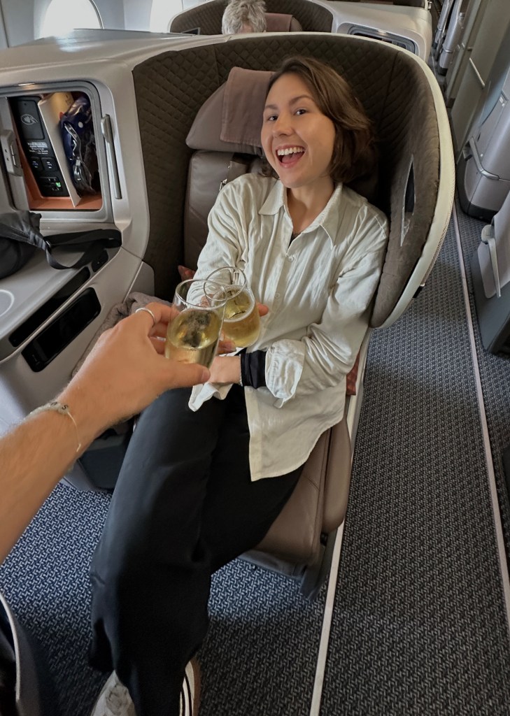 Obwohl unser Treffen ins Wasser fiel, wollten Leon und ich unseren Flug nach Cairns nicht verfallen lassen. Immerhin hatten wir uns einen Business-Class-Flug mit Meilen gegönnt – unser erstes Mal mit Singapore Airlines! Der Flug war ziemlich leer, weshalb der Service etwas eingeschränkt war. Nach dem guten Ruf der Airline hatte ich mir zwar noch ein bisschen mehr erwartet, aber insgesamt war es dennoch ein tolles Erlebnis.