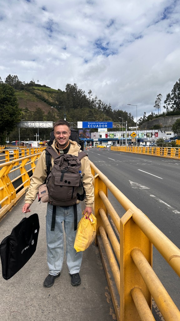 Statt nach Ecuador zu fliegen, entschieden Leon und ich uns diesmal für einen anderen Weg: Mit dem Bus bis zur kolumbianischen Grenze – und dann zu Fuß rüber. Es war aufregend und irgendwie cool. Vor Ort lief alles problemlos, auch wenn einem manche Leute versuchen wollen, teure Taxis aufzuschwatzen – angeblich zur Sicherheit. Aber: Der Grenzübergang dauert nur ein paar Minuten, Polizei ist genug da, und die Fragen bei der Migration sind dieselben wie am Flughafen. Nur dauert alles gefühlt fünfmal so lange.