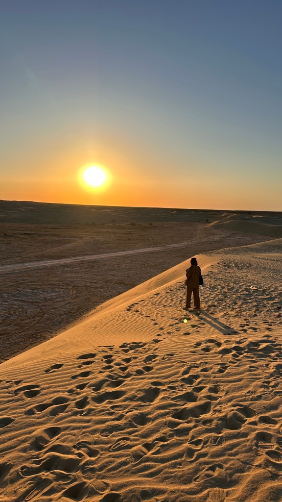 Nach der turbulenten Hochzeitszeit ging es für uns sieben Stunden Richtung Süden – in die Sahara. Und die verzauberte uns vom ersten Moment an. Wir hatten zuerst in Tozeur ein süßes Airbnb gebucht, der Host war wundervoll – und das Haus ebenso. Er empfahl uns einen Sunset-Spot, und wenig später saßen wir mitten in der Wüste in Nefta und blickten auf den runden Feuerball über den Sanddünen und das alte Star Wars Filmset. Irgendwie war das surreal – aber unglaublich schön!