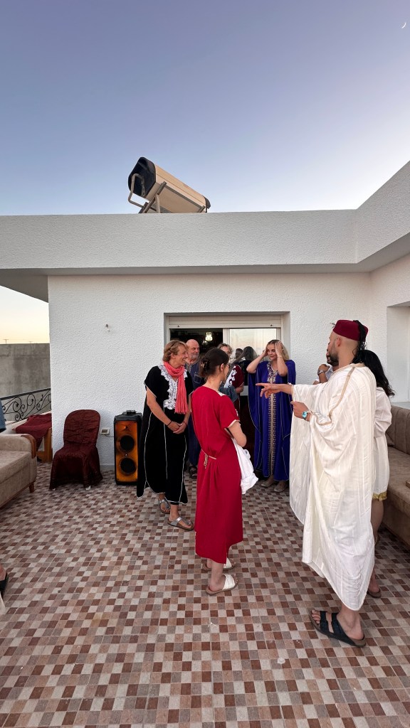 Als die Feier begann und wir sehr leckere tunesische Pasta aßen, waren sofort alle aus dem Häuschen. Es gab eine Band – und die spielte gefühlt stundenlang. Alle tanzten und sprangen herum. Leon und ich waren anfangs etwas überfordert vom Tanzstil (vor allem nüchtern), aber man groovt sich schnell ein – und dann macht es richtig Spaß. Ich hatte das Gefühl, dass die Party mit jeder Minute wilder wurde, bis um Mitternacht alles endete. Ruhestörung scheint in Tunesien kein großes Thema zu sein – zumindest wurden durch die Terrasse, auf der wir feierten, alle Nachbarn gleich mitbeschallt.