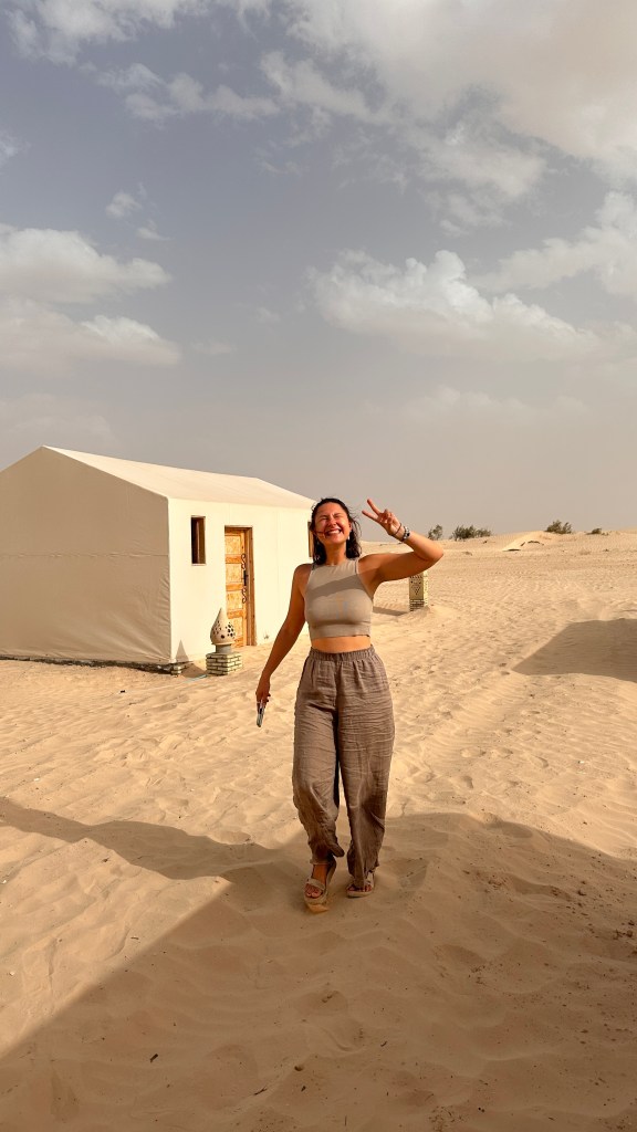 Danach fuhren wir weiter nach Douz in ein Wüstencamp, wo es doch viel heißer war, als wir dachten. Trotz allem hielt uns das nicht davon ab, auf Kamelen zu reiten, Quad zu fahren und Sandboarden zu gehen. Ein touristisches, aber irgendwie doch wunderbares Abenteuer. Das Essen war vorzüglich und das Gefühl am Morgen mit Blick auf die Sanddünen aufzuwachen einmalig.